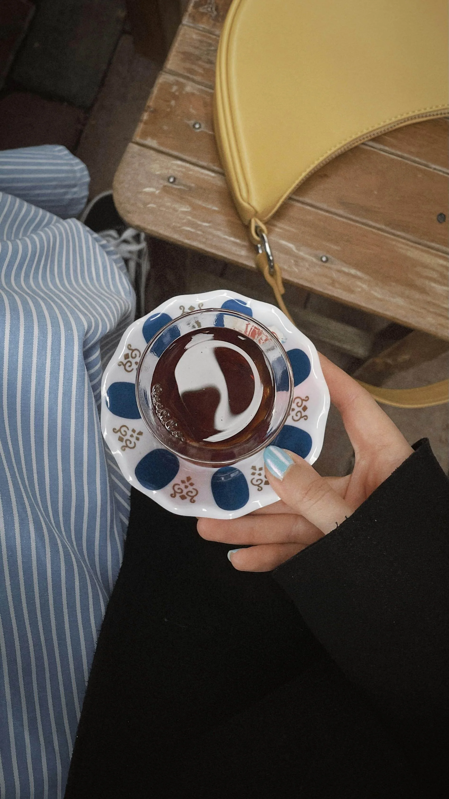 A cup of tea in a real cup, sitting down.